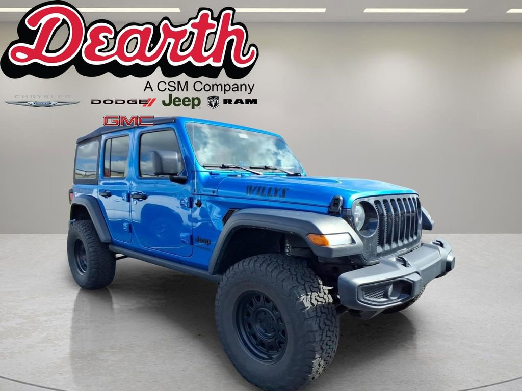 2022 Jeep Wrangler Unlimited Willys Recent Arrival! Hydro Blue Pearl Coat 2022 Jeep Wrangler Unlimited Willys 4WD 8-Speed Automatic 2.0L I4 DOHC Local Trade, Non-Smoker, 1-Owner, 1-Year SiriusXM Guardian Trial, 2-Door Passive Entry, Front Door Locks, 220 Amp Alternator, 240 Amp Alternator, 4G LTE Wi-Fi Hot Spot, 5-Year SiriusXM Traffic Service, 5-Year SiriusXM Travel Link Service, 7 & 4 Pin Wiring Harness, 700 Amp Maintenance Free Battery, 8.4 Radio & Premium Audio Group, 8.4 Touchscreen Display, Air Conditioning w/Auto Temperature Control, Air Filtering, Alpine Premium Audio System, Auto-Dimming Rear-View Mirror, Auxiliary Switches, Class II Receiver Hitch, Cluster 7.0 TFT Color Display, Electronic Stability Control, Emergency/Assistance Call, GPS Navigation, HD Radio, Off-Road Info Pages, ParkView Rear Back-Up Camera, Radio: Uconnect 4C Nav w/8.4 Display, Remote Keyless Entry, SiriusXM Radio Service, SiriusXM Satellite Radio, SiriusXM Traffic Plus, SiriusXM Travel Link, Technology Group, Trailer Tow & HD Electrical Group, Willys. Priced below KBB Fair Purchase Price!